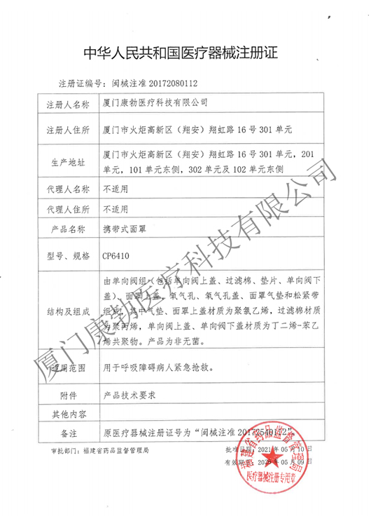 攜帶式面罩注冊(cè)證