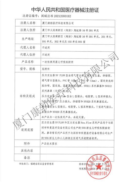 一次性使用嬰兒呼吸機(jī)附件和附件列表及變更文件 產(chǎn)品注冊證